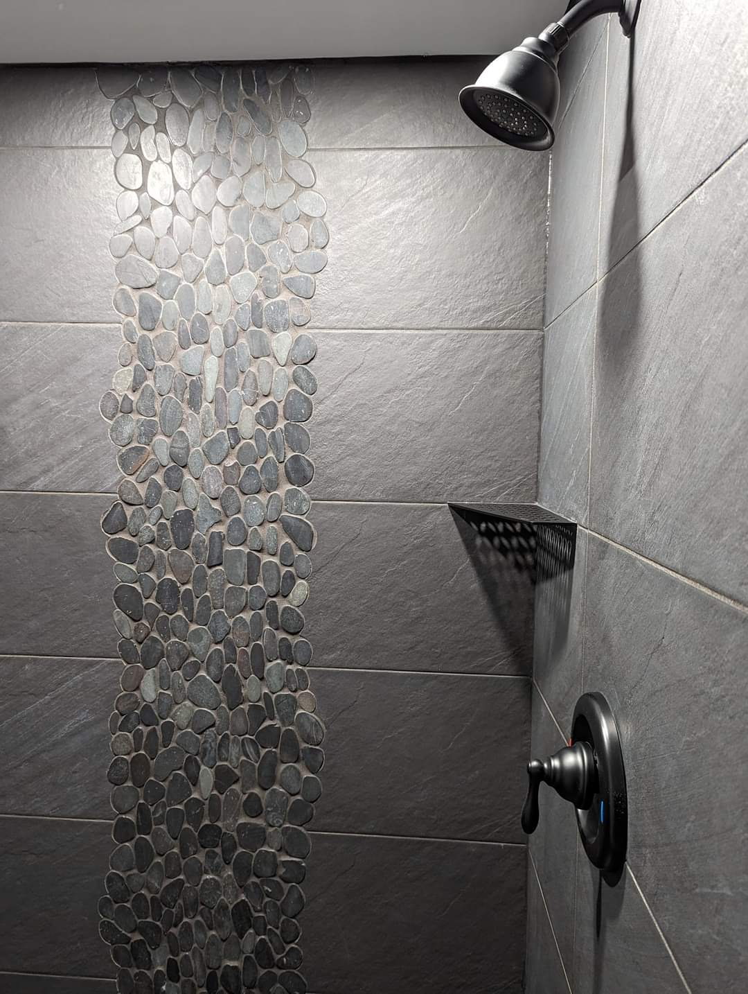 Floor-to-ceiling marble tile with pebble floor, corner bench, and accent niche with glass tile.